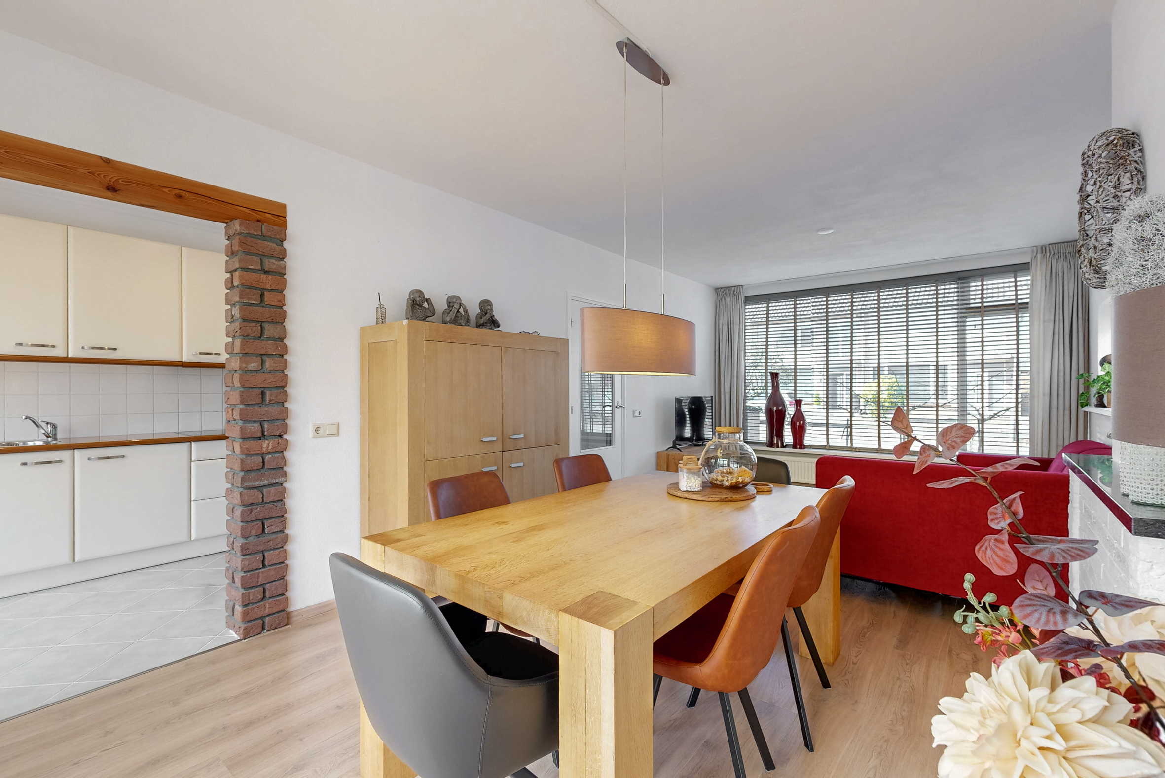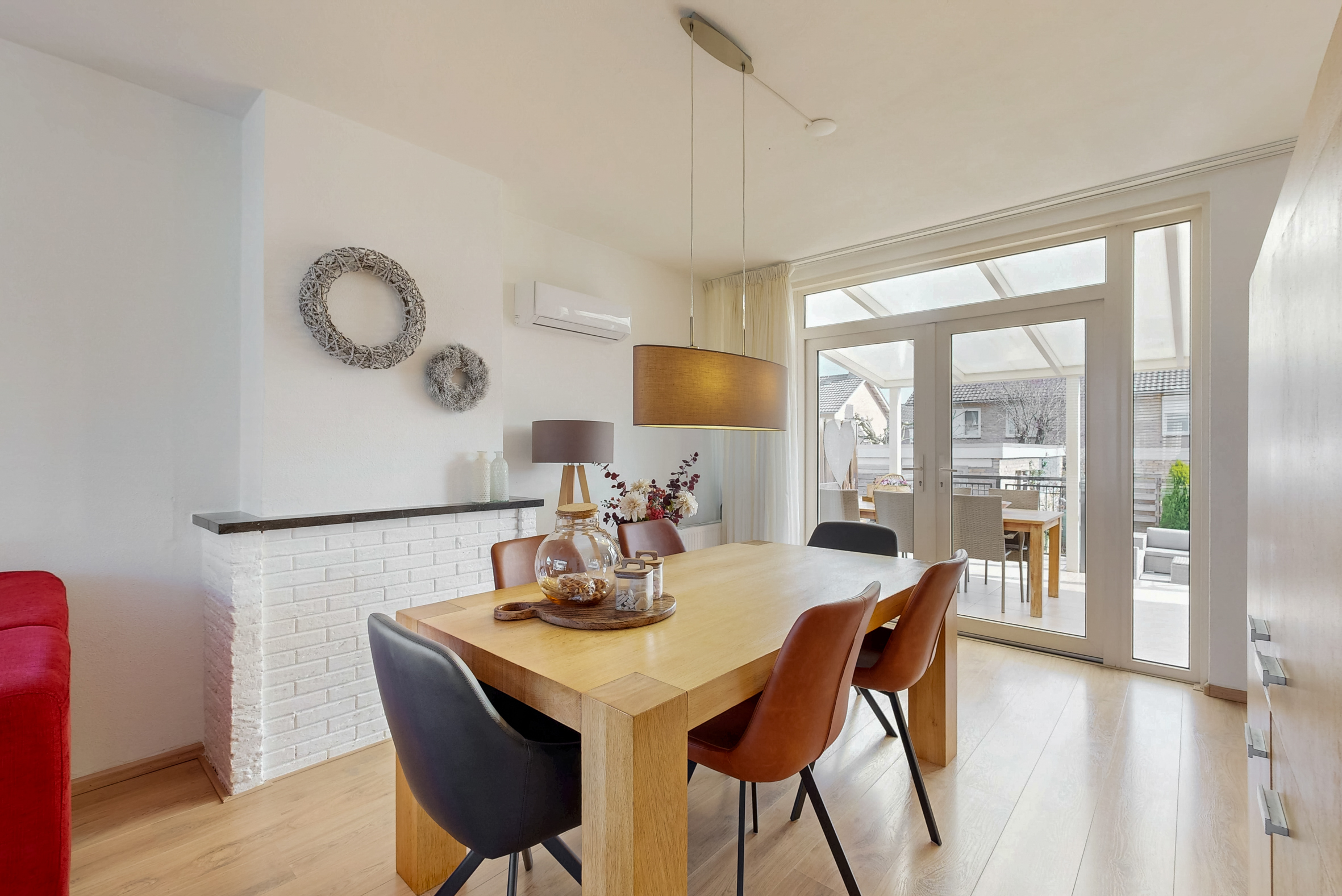 - Woonkamer met tuindeuren naar het overdekte terras en voorzien van een airco (2022), met functie koelen en verwarmen;