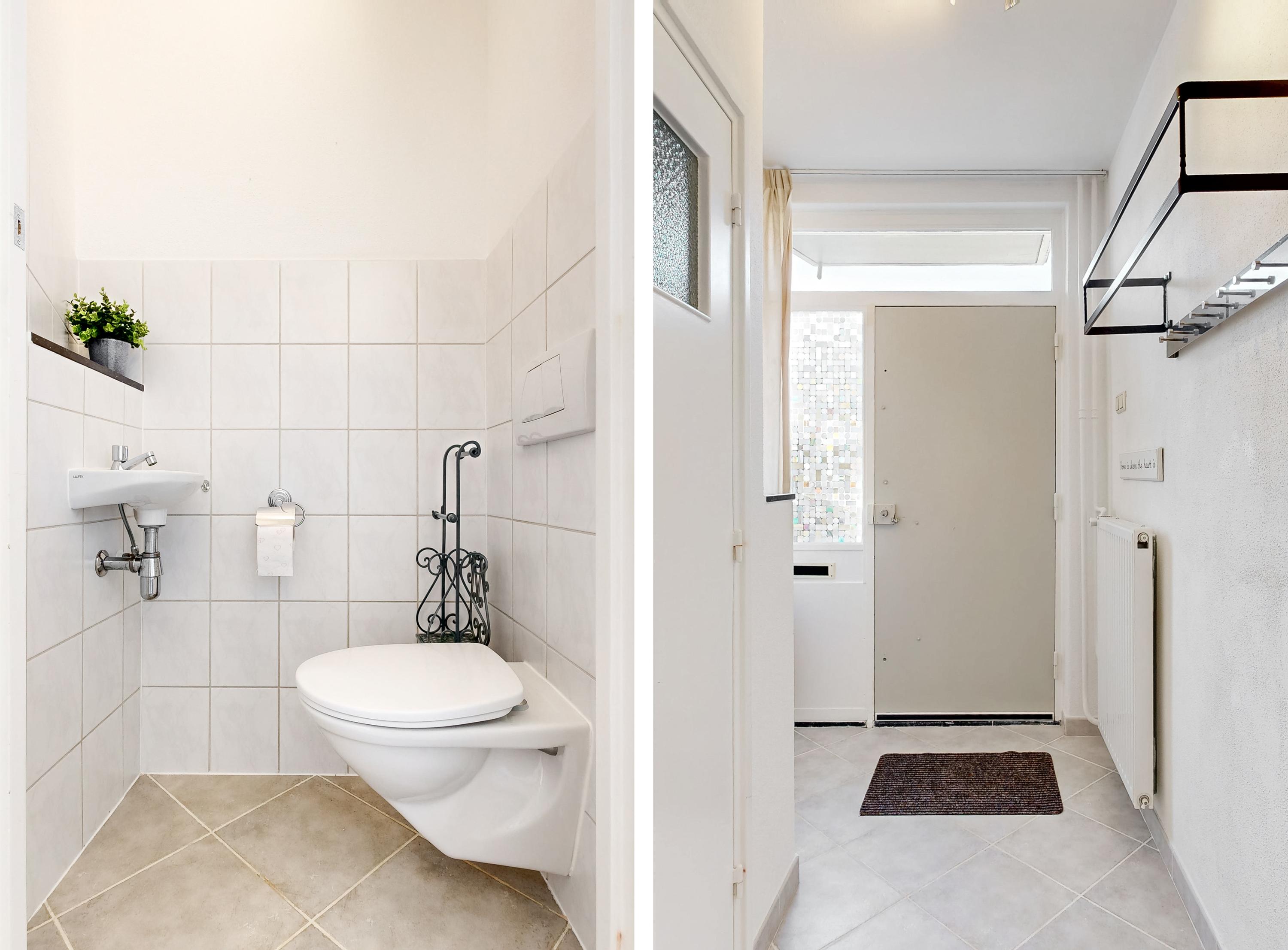 Hal/entree met licht grijze tegelvloer, meterkast en de moderne toiletruimte met zwevend toilet en een fonteintje. De sfeervolle woonkamer van ca. 26 m2 is voorzien van een mooie (houtlook) laminaatvloer en via openslaande tuindeuren is er de toegang naar het overdekt terras.