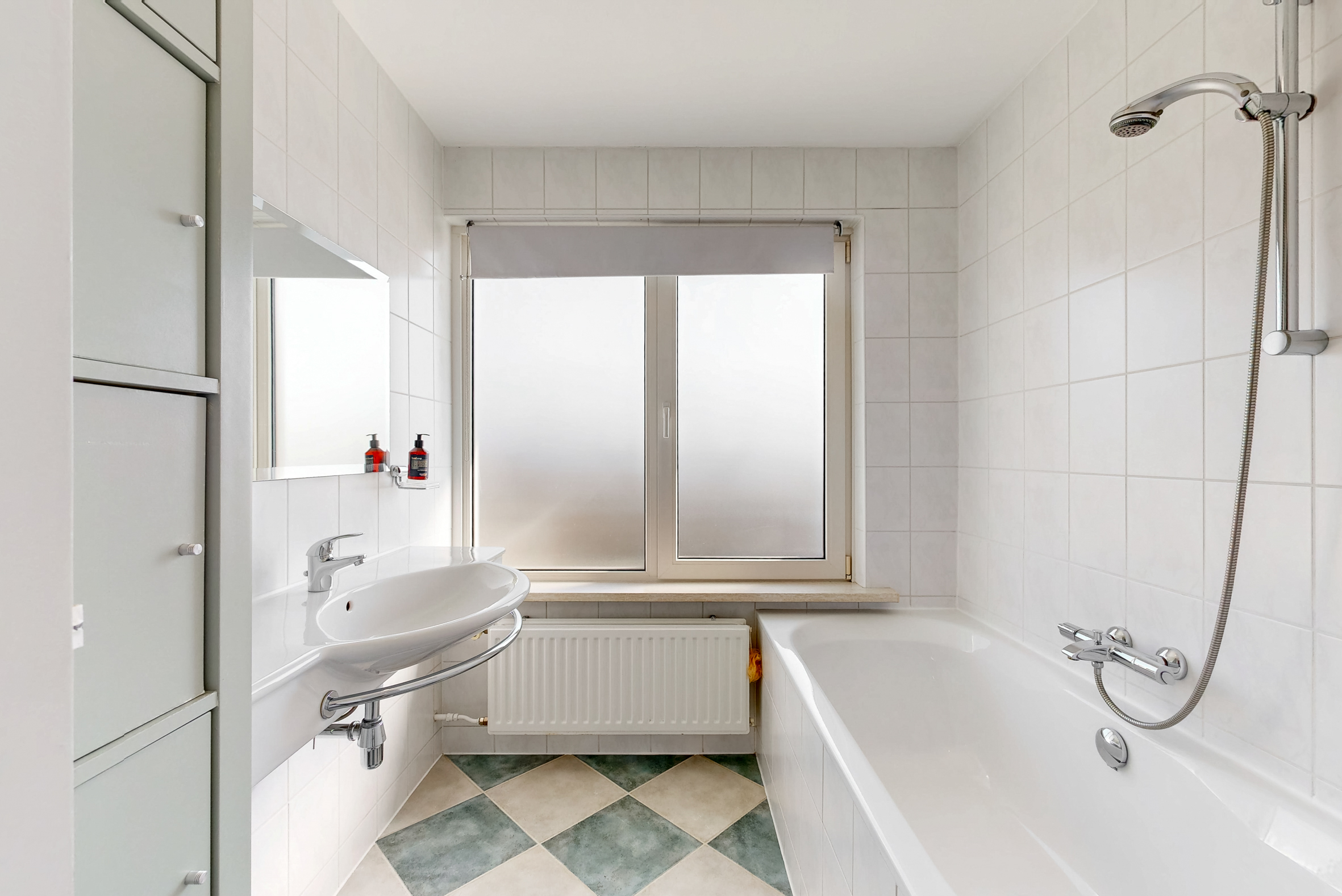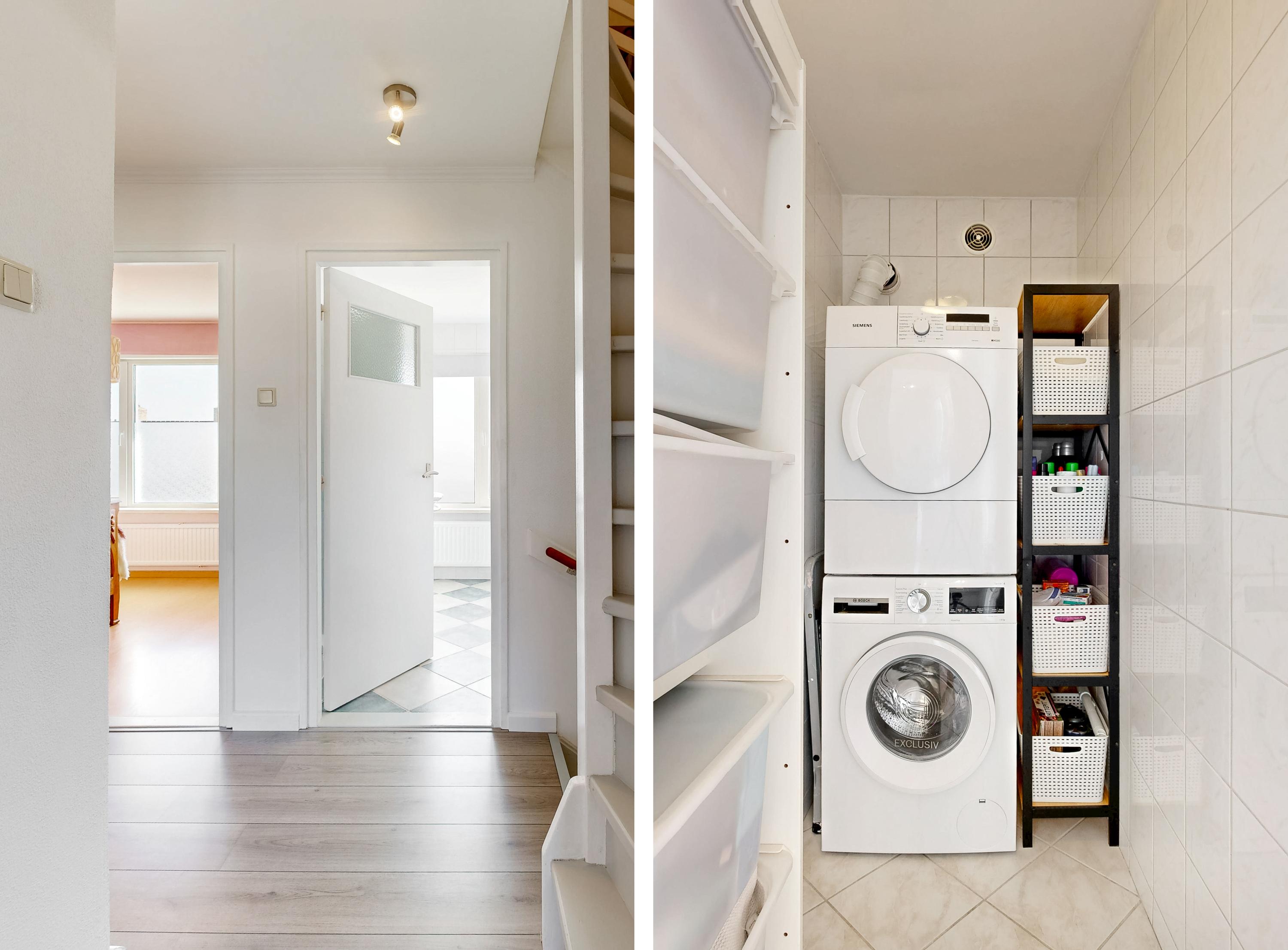 verder bevindt zich op deze verdieping de geheel betegelde nette lichte badkamer met ligbad-/douche cabine, wandcloset en vaste wastafel en is er een handige aparte betegelde wasruimte met de witgoedopstellingen.