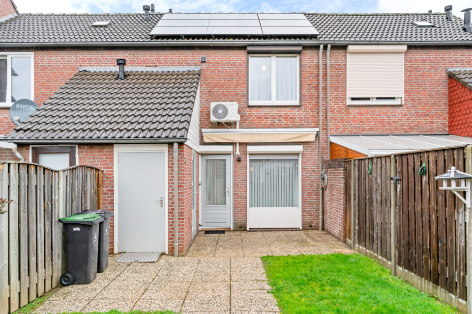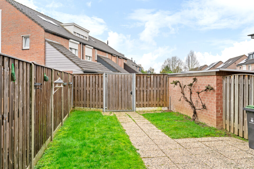 Via de achterdeur (met elektrisch rolluik) is er de toegang naar de onderhoudsvriendelijke zonnige tuin met eigen berging (ca. 5m2) en een handige achterom.